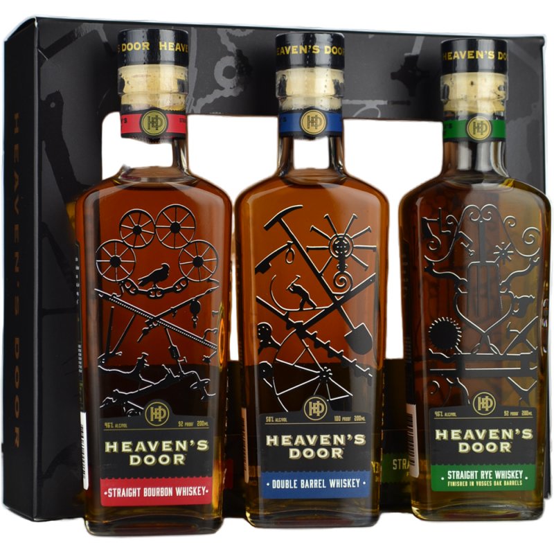 This three bottle presentation of whiskeys in the Heavens Door range presented in a black presentation box consists of: